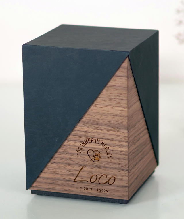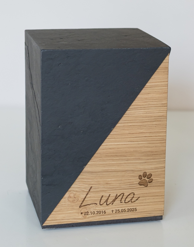 Die eckige Tierurne Sirius steht für moderne Ästhetik, natürliche Materialien und sorgfältige Handwerkskunst. Das warme Echtholzfurnier in Verbindung mit der fein abgestimmten, diagonal verlaufenden Schieferfurnierfront verleiht der Urne eine ruhige, harmonische Anmutung und eine besonders würdevolle Ausstrahlung.Die klare Formensprache und die natürlichen Oberflächen machen die Sirius-Tierurne zu einem zeitlosen Erinnerungsstück, das sich dezent und stilvoll in jedes Wohnambiente einfügt. So entsteht ein Ort der stillen Verbundenheit – persönlich, zurückhaltend und voller Wertschätzung.