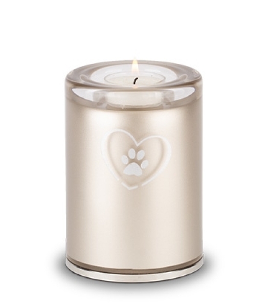 Tierurne aus Glas mit Herz-Pfoten-Gravur und Gedenklicht in versch. Farben und Größen