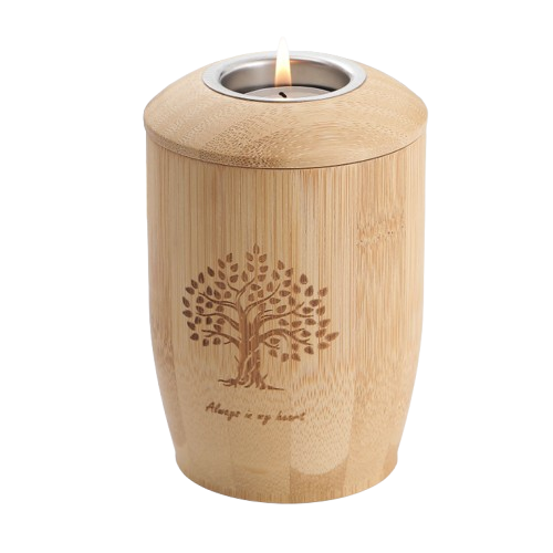 Bambusurne mit Lebensbaum-Gravur und Spruch „Always in my heart“ in 0,5 Liter