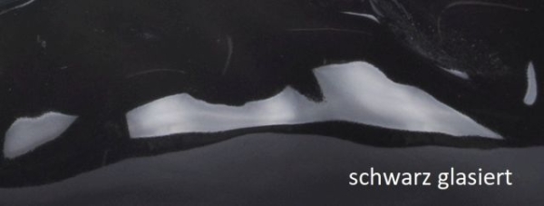 - schwarz glasiert: Nach dem ersten Brand der Keramik wird die einfarbige Glasur aufgebracht und erneut im Ofen gebrannt. Dadurch wird die Oberfläche glasig/glänzend.