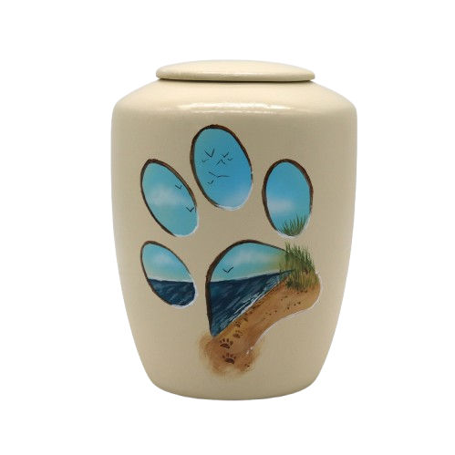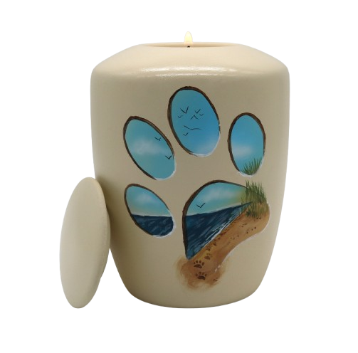 Diese handbemalten Tierurnen sind aus Keramik und mit dem Motiv "Pfötchenparadies" in liebevoller Handarbeitet in Deutschland gestaltet.3 verschiedene Formen stehen zur Auswahl. Bei der Herzform hebt sich auf der rechten Seite ein kleines Dekoherzchen besonders hervor. Es steht für die unendliche Liebe zu Ihrem verstorbenen Liebling und kann zum Kuscheln einfach abgenommen werden. Die klassische Variante hat einen Gedenklichteinsatz, der mit einer kleinen Haube aus Keramik abgedeckt werden kann. Die Würfelurne ist modern und zeitlos.