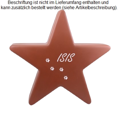 Diese Tierurne aus Keramik gibt es in drei verschiedenen Größen und in verschiedenen Ausführungen ganz nach Ihren Vorstellungen. In Handarbeit wird die Sternform in Deutschland hergestellt.Die Urne ist in 2 Ausführungen erhältlich: