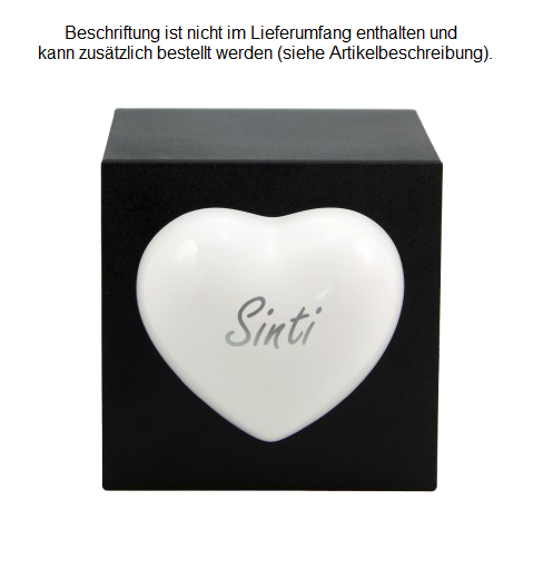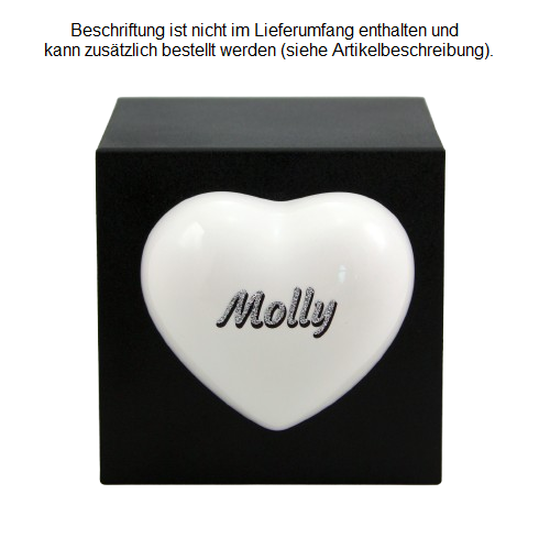 Diese stilvolle Tierurne in Würfelform verbindet eine klare, moderne Gestaltung mit einem liebevollen Detail. Der würfelförmige Korpus besteht aus Metall und ist in den Farben Schwarz, Weiß oder Braun erhältlich. Zusätzlich stehen 2 verschiedene Größen zur Auswahl, sodass Sie die passende Ausführung für Ihr Tier wählen können.Ein besonderer Blickfang ist das Herz aus Keramik, das im Lieferumfang enthalten ist. Es lässt sich magnetisch am Würfel befestigen und kann ganz nach Wunsch auf dem Würfel platziert werden. So entsteht eine individuelle und persönliche Optik. Das Keramikherz ist in Schwarz oder Weiß erhältlich und bildet einen schönen Kontrast oder eine harmonische Ergänzung zur gewählten Urnenfarbe.