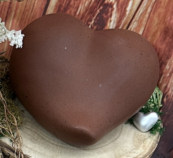 Das Herz hat eine leicht zur Seite geschwungene Form und ist halb liegend. Sie können diese handgefertigte Keramik-Tierurne im Innenbereich oder im Außenbereich auf dem Balkon, der Terrasse oder im Garten platzieren. Das Herz ist durch den hohen Brand frostsicher und witterungsbeständig.