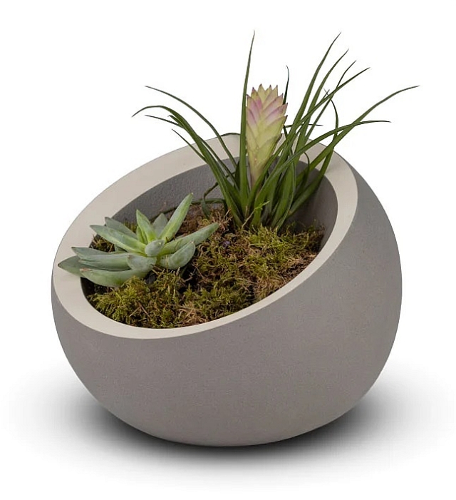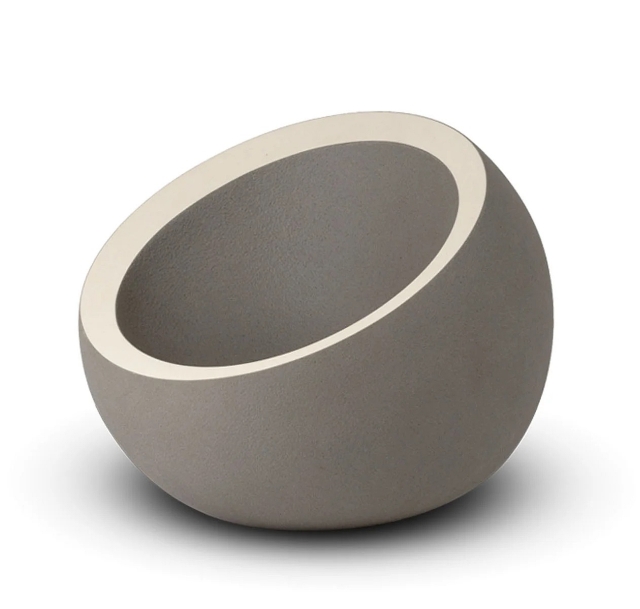 Die schlichte graue Oberfläche wird durch einen dezenten weißen Rand um die Pflanzmulde ergänzt. Dieses Detail setzt einen ruhigen, eleganten Akzent und unterstreicht die klare Formgebung der Urne. Die reduzierte Gestaltung fügt sich harmonisch in unterschiedliche Umgebungen ein – ob im Wohnraum oder im Garten.