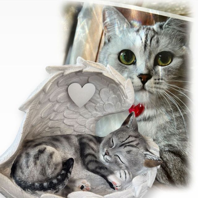 Wenn ein geliebter Weggefährte seine letzte Reise antritt, bleibt eine Lücke zurück – doch auch unendlich viele Erinnerungen an gemeinsame Momente, leises Schnurren, sanfte Pfoten und tiefe Verbundenheit.Diese liebevoll gestaltete Urne aus Polyresin fängt genau dieses Gefühl ein: Die Form zeigt eine schlafende Katze, geborgen in schützenden Engelsflügeln – als würde sie in einem letzten, sicheren Nest ruhen, gehalten von Liebe und Licht.