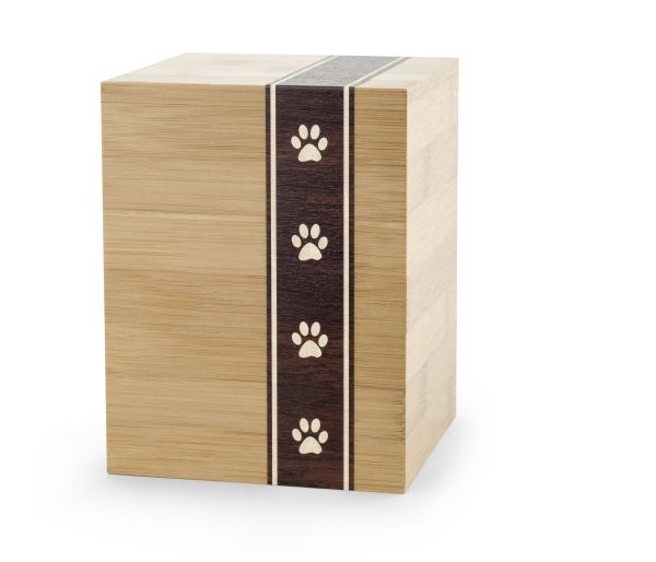Diese hochwertige Holzurne in andächtiger Kubusform hat ein Echtholzfurnier, welches mit einem Band aus Pfötchen verziert ist. Die Pfötchenabdrücke befinden sich vorne und hinten auf der Urne.In vier verschiedenen Holzarten (Mahagoni, Kanadischer Ahorn, Amerikanischer Nussbaum oder Bambus) und in 3 verschiedenen Größen ist die edle Urne erhältlich.
