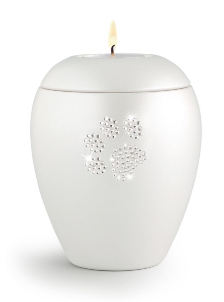 Die Keramikurne der "Edition Crystal" besitzt eine perlmuttschillernde Oberfläche. Sie ist auf der Vorderseite verziert mit einer Pfote aus hochwertigen Kristallen, die in liebevoller Handarbeit aufgebracht werden. Die Kristalle in Form einer Tatze und die besonders gestaltete Oberfläche machen diese ursprüngliche Urnenform zu einer hochwertigen letzten Ruhestätte für Ihren tierischen Liebling.Die Volumen 0,5 Liter und 1,5 Liter sind auf Wunsch auch mit Gedenklichteinsatz für ein Teelicht lieferbar.